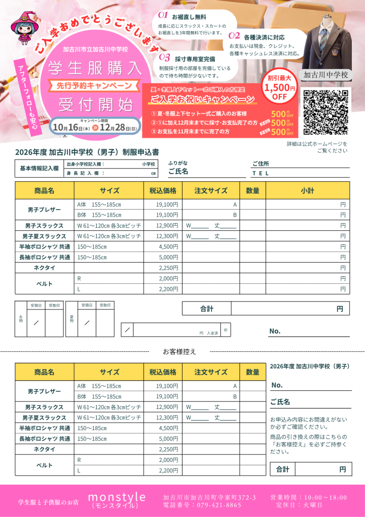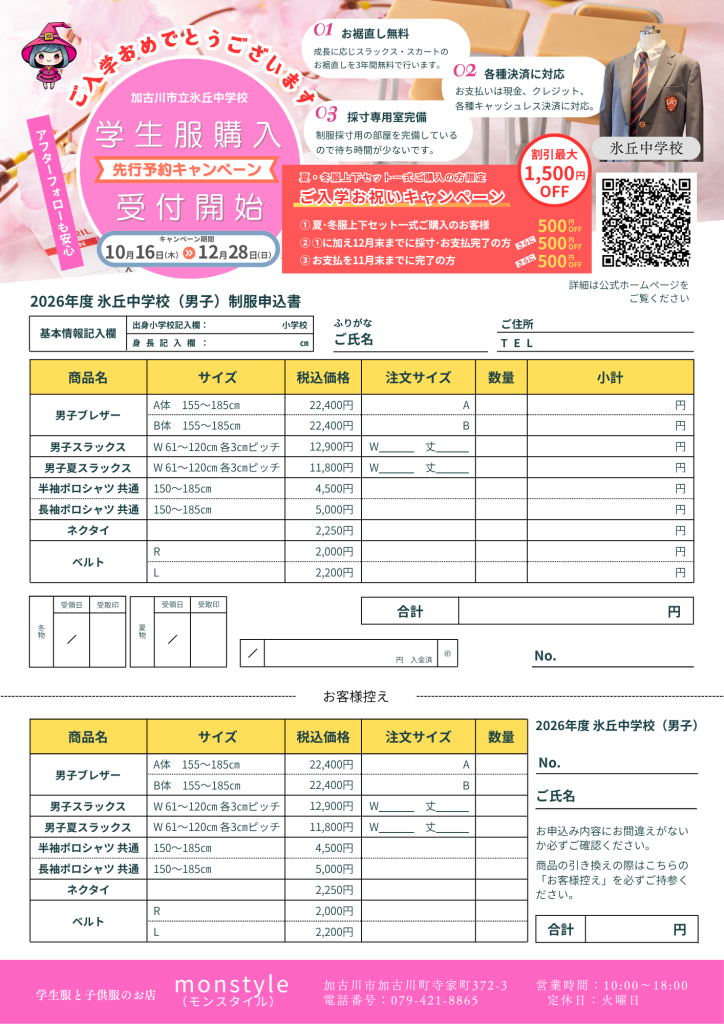 monstyle(モンスタイル)は加古川中学校、氷丘中学校 制服指定取扱店舗です。